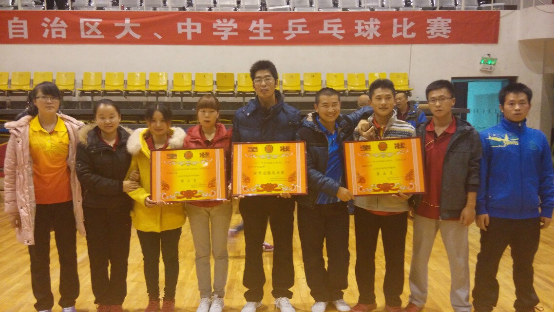 11月5—9日,我校派出由体育工作部杨建军主任带队,教练员李帅许老师,运动员孔帅令、陈川、李可、苏雪峰、董小凤、何玉玲、何文静、马瑞杰共10人组成的代表队参加了在石河子大学举行的2014年新疆维吾尔自治区大、中学生乒乓球比赛。我校荣获“体育道德风尚奖”,以及女子团体第三名、男子团体第五名、女子单打第四名、女子双打第四名的好成绩。