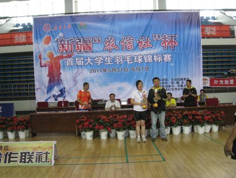 5月30日至6月1日,我校派出由体育工作部王军老师带队,教练员连殿冬老师,运动员蒋彬、刘翀、张金峰、赵妍竹和白静共7人组成的代表队参加了在新疆大学举办的“新疆‘农信社’杯首届大学生羽毛球锦标赛”。我校荣获 “精神文明队”称号,及男子双打第二名,男女混双第三名、第六名,女子单打第七名的好成绩。