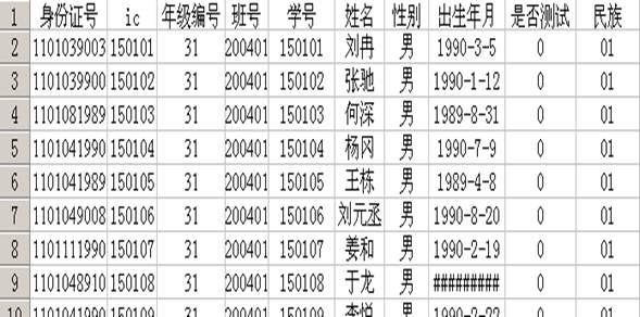 此文件必须为Excel文件形式。Excel文件中的列表必须按规定的格式填写,将身份证号、ic、年级编号、班号、学号、姓名、性别、出生年月、是否参加测试、民族这些项目依次排列(附件),这样才能保证导入的成功。其中“ic” 是指IC卡号,IC卡号为空, “年级编号”为本班专业名称;“班号”不用填写;“是否参加测试”项中,参加测试输入“0”,如果不参加测试的话输入“1”;“民族”一栏中,要填入学生的民族代码,民族代码请参见附表1。要注意的是在输入数据的过程中,除了“出生年月”一项为日期格式外其它的九项都应为文本格式。正确的信息数据,请务必满足以上所有条件。
